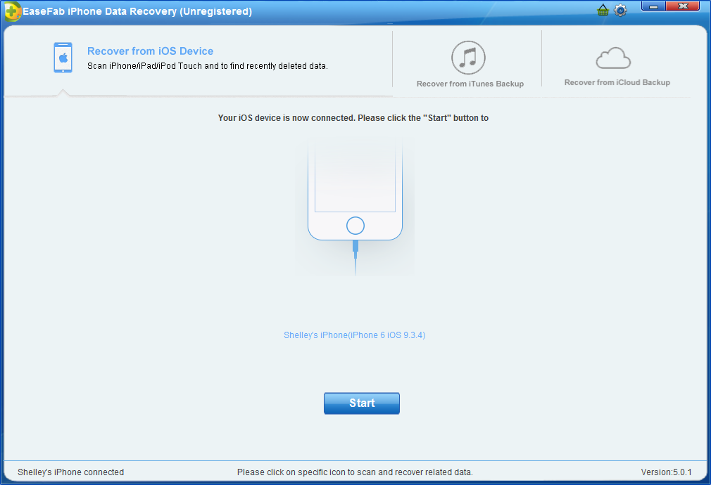 Connect your iPhone to your PC and run EaseFab iPhone Data Recovery program on your computer. Then you'll see the main window as follows. Simply click Start button to begin.