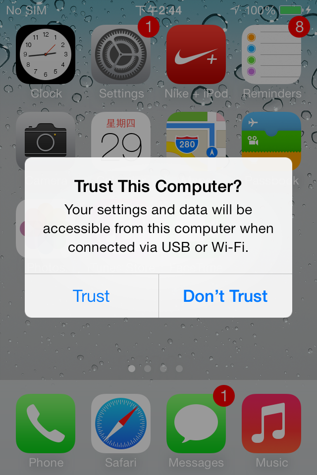 2) For functioning device, if it's the first time you connect device to this computer, click Trust, when the dialog box below appears on your device.